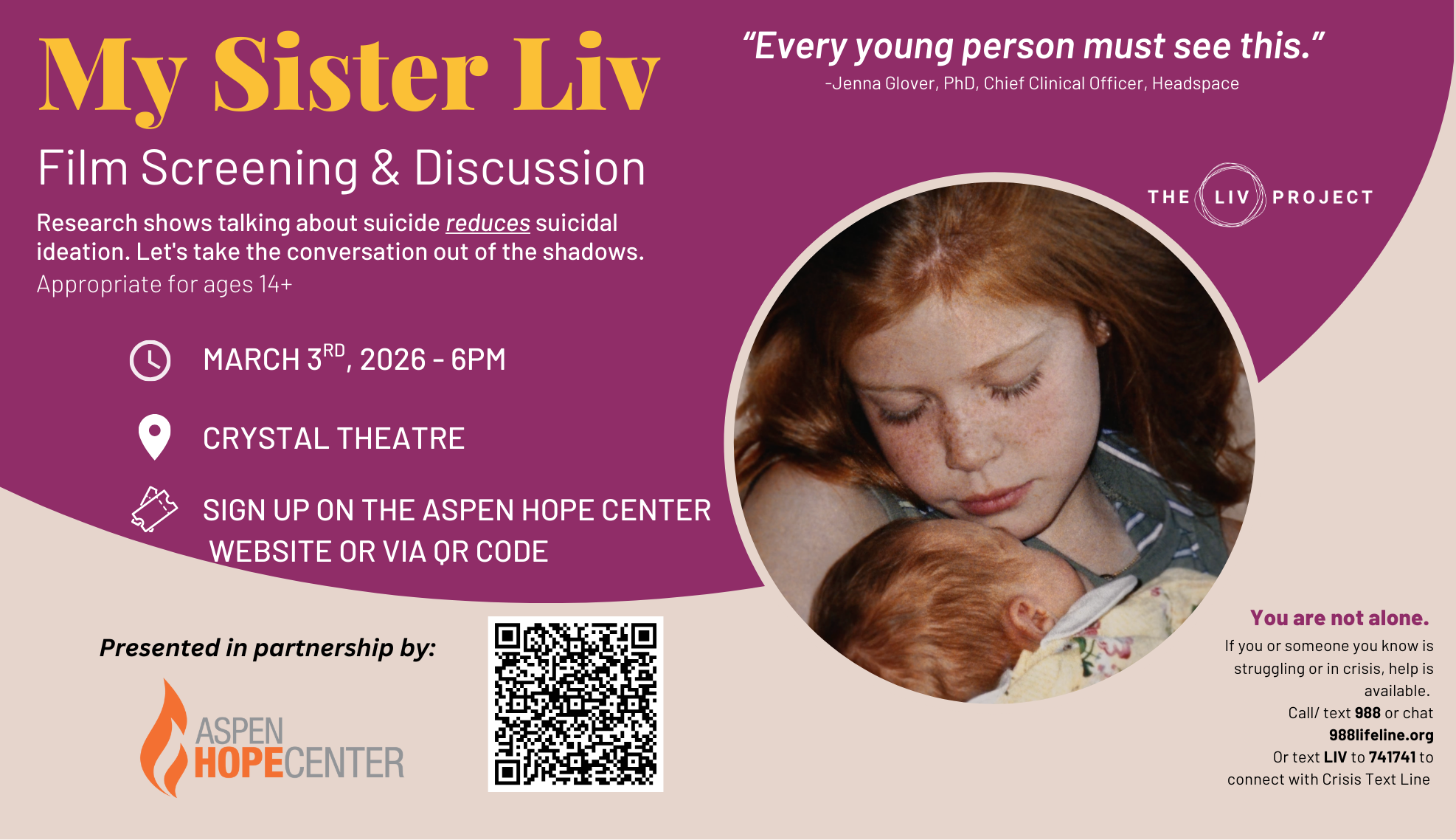 *DISCLAIMER: The film, My Sister Liv, presented by The Liv Project, discusses youth mental health and suicide. Participation is optional. This film has been crafted with a team of therapists, including Susan Caso, MA LPC, The Liv Project’s Mental Health Director. In addition, the film was vetted by team members at the Children's Hospital Colorado Pediatric Mental Health Institute to ensure the content was accurate and safe. The film has been approved for youth ages 14 and up. Topics in the film include suicide, depression, anxiety, self-harm, bullying, sexual assault, eating disorders, and grief. Please take care while watching.*